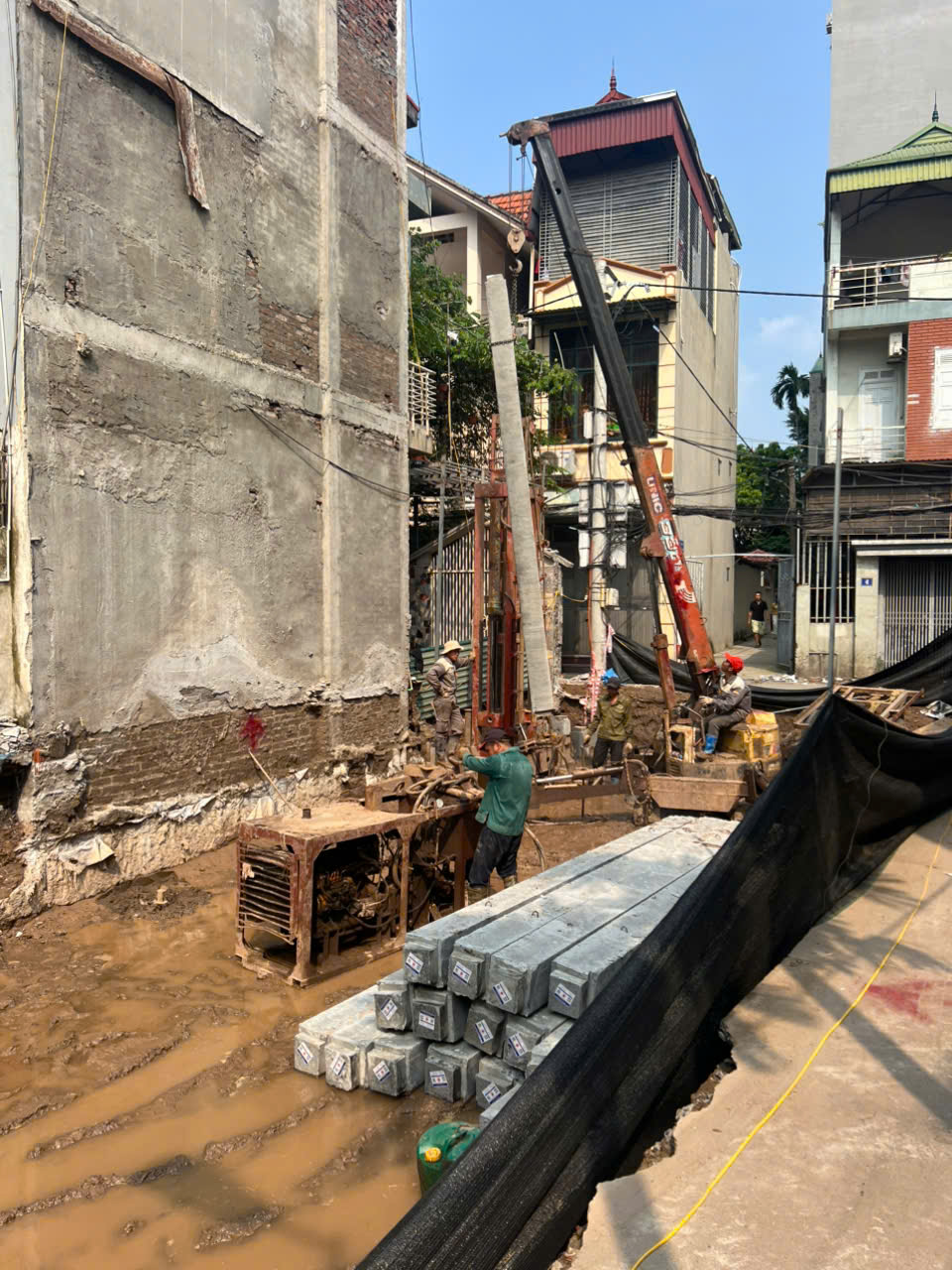 Việc thi công trên khu đất chật hẹp, nằm xen kẽ giữa các nhà dân tại Tây Mỗ là một thách thức lớn.